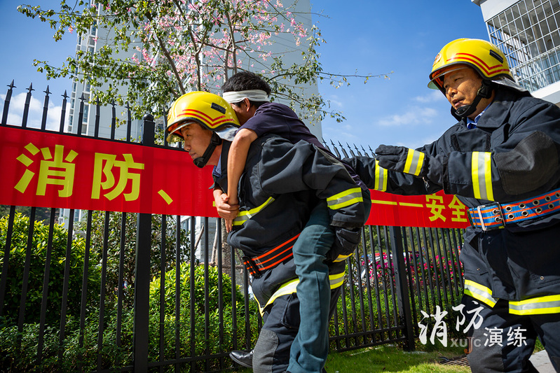 演练过程中,保卫部校卫队员与消防指战员迅速响应,分别协同漳州开发区医院救护人员,有条不紊地展开模拟伤员抢救行动。两组抢险人员配合默契,动作娴熟,以最快速度支起担架,稳稳当当地将“受伤”人员抬上救护车。
