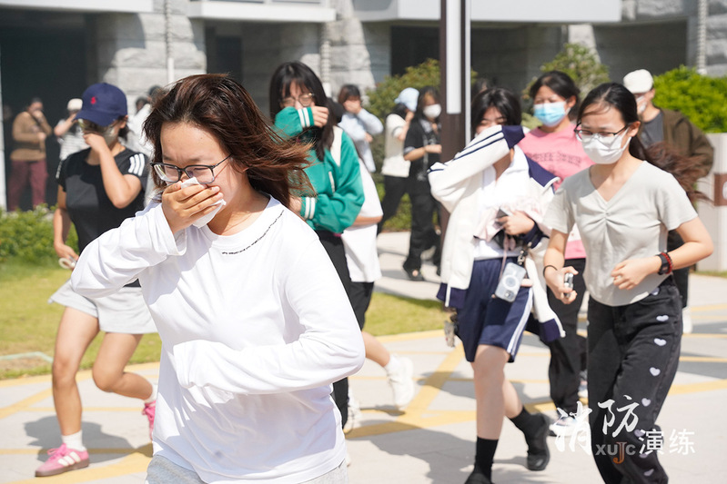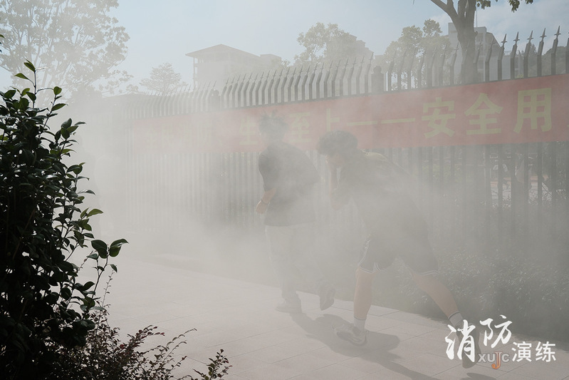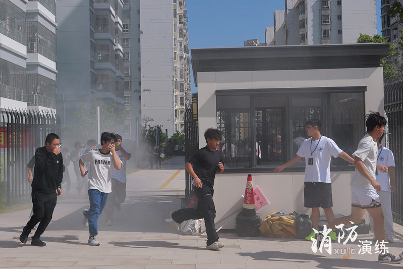 演练开始,模拟烟雾释放,火灾警报信号骤然响起。当班安防队员迅速确认火情并报告,南强物业即刻启动应急预案,校卫队同步触发火灾警报机制。微型消防站紧急出警,安保队员携带灭火器材火速赶赴“火场”。与此同时,同学们用手捂住口鼻,迅速从宿舍跑出,在保卫部工作人员的引导下,沿着预定路线有序撤离。